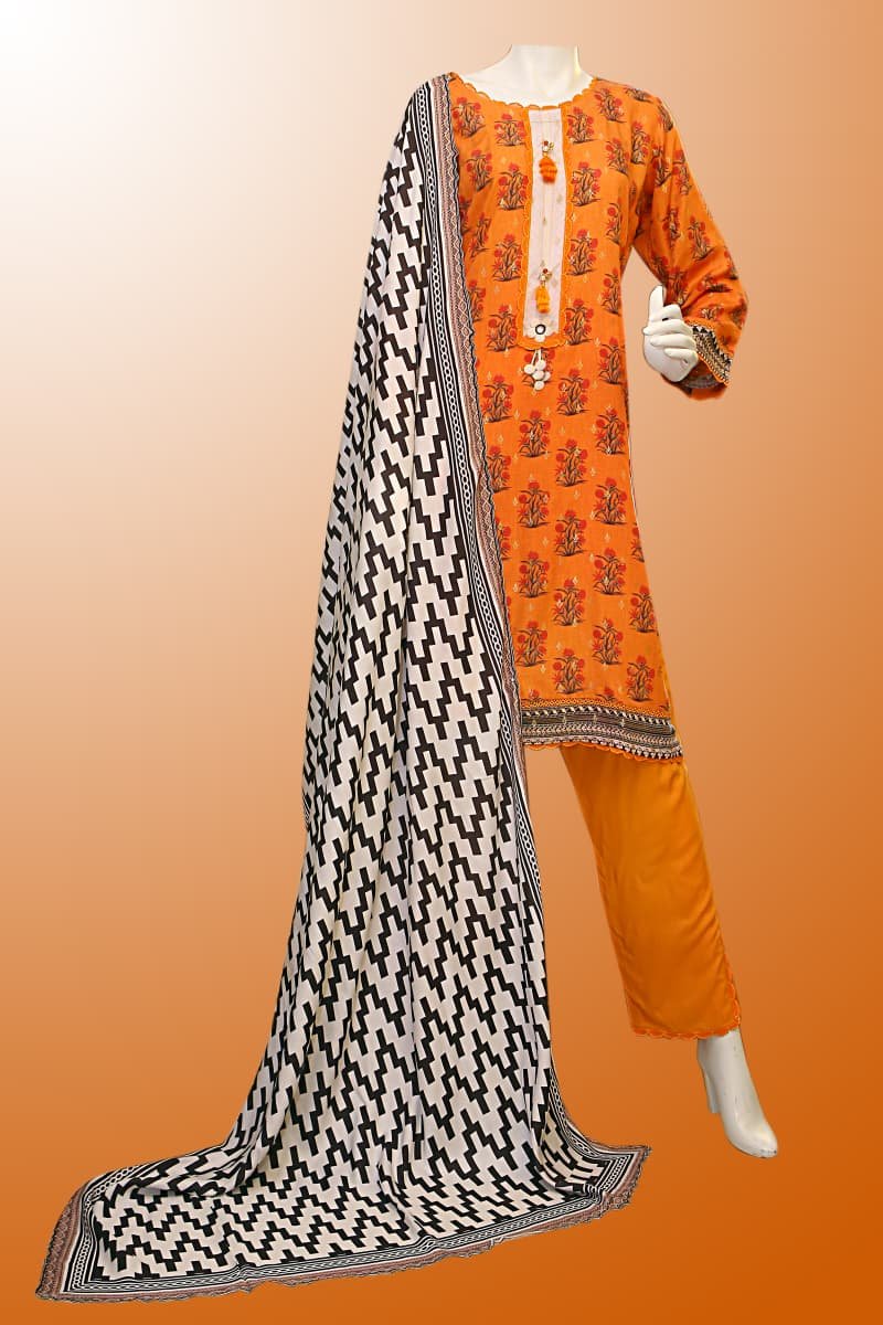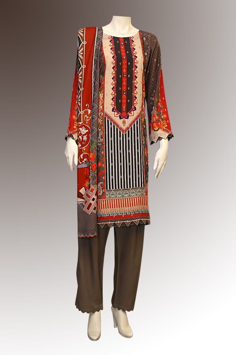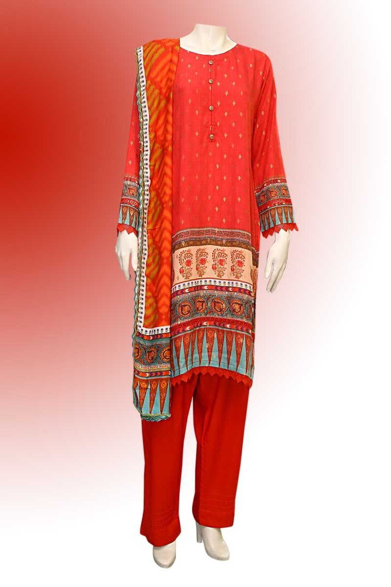 Add a touch of contemporary charm to your wardrobe with Poshak Mahal’s Printed Viscose Jacquard 3Pc Suit. Crafted from premium-quality viscose, this set features a beautifully printed jacquard shirt, matching trousers, and a complementary printed linen dupatta. Its lightweight, breathable fabric makes it ideal for casual outings or semi-formal events, combining comfort and elegance effortlessly.