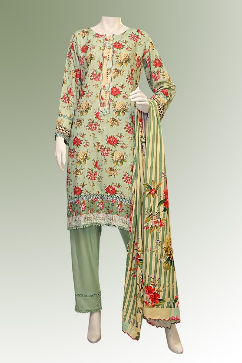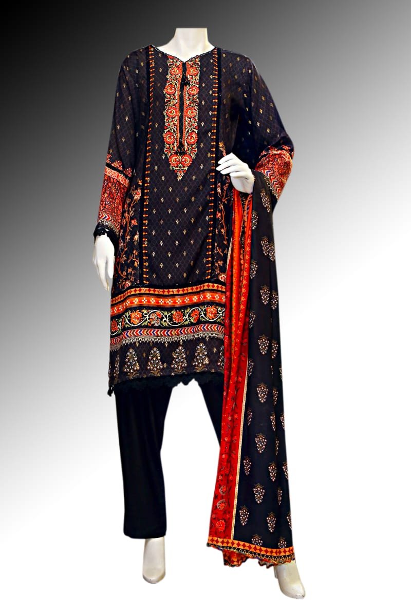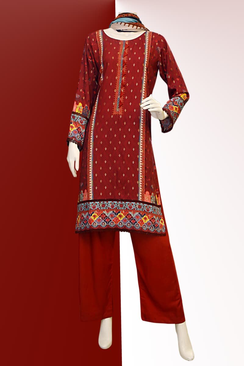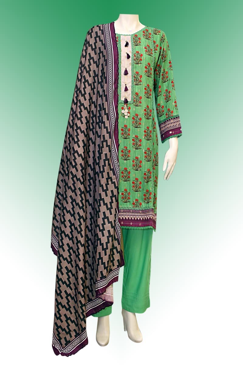 Add a touch of contemporary charm to your wardrobe with Poshak Mahal’s Printed Viscose Jacquard 3Pc Suit. Crafted from premium-quality viscose, this set features a beautifully printed jacquard shirt, matching trousers, and a complementary printed linen dupatta. Its lightweight, breathable fabric makes it ideal for casual outings or semi-formal events, combining comfort and elegance effortlessly.